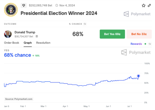 بر اساس داده های پلی مارکت، سفته بازان در پلی مارکت بازار پیش بینی مبتنی بر اتریوم نیز به سرعت شرط بندی کردند، با توجه به داده های پلی مارکت، با احتمال پیروزی ترامپ در انتخابات آتی از 60 درصد به 68 درصد بلافاصله پس از اقدام به ترور.