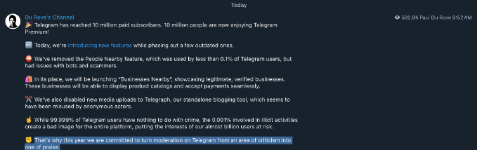 دوروف به دنبالکنندگانش گفت که بارگذاریهای رسانهای در پلتفرم وبلاگنویسی توسط بازیگران مخرب “سوء استفاده” شده است و توضیح داد که اکثریت قریب به اتفاق جامعه تلگرام از این ویژگیها سوء استفاده نمیکنند. با این حال، دوروف تصریح کرد که «0.001 درصد درگیر در فعالیتهای غیرقانونی» خطری نامتناسب برای اکثریت قریب به اتفاق کاربران قانونمند در تلگرام ایجاد میکند.