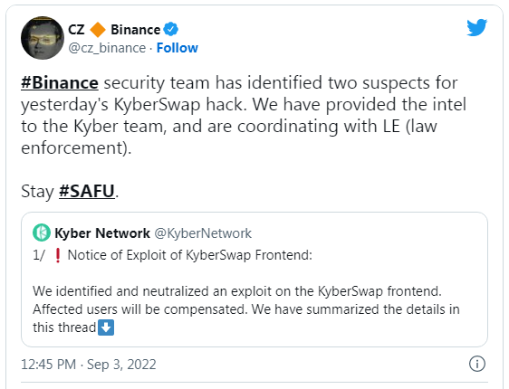 چانگ پنگ ژائو ، مدیر عامل بایننس فاش کرد که تیم امنیتی بایننس دو مظنون را شناسایی کرده و اطلاعات را به KyberSwap و مجری قانون ارسال کرده است. بایننس اکنون نقش یک برادر بزرگ را در فضای کریپتو بازی می کند. یکی از اعضای کریپتو توییتر اشاره کرد که بایننس از امنیت پلتفرم خود فراتر رفته و کل اکوسیستم کریپتو را ایمن کرده است.