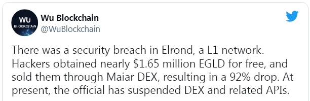 وو بلاک چین گزارش می دهد که شبکه لایه 1 الروند با توکن هایی به ارزش بیش از 1.65 میلیون دلار به سرقت رفته و در بازار رها شده است، که باعث سقوط گسترده 95 درصدی توکن EGLD شد. بنا بر گزارش ها هدف این حمله یک تبادل خاص بوده است.