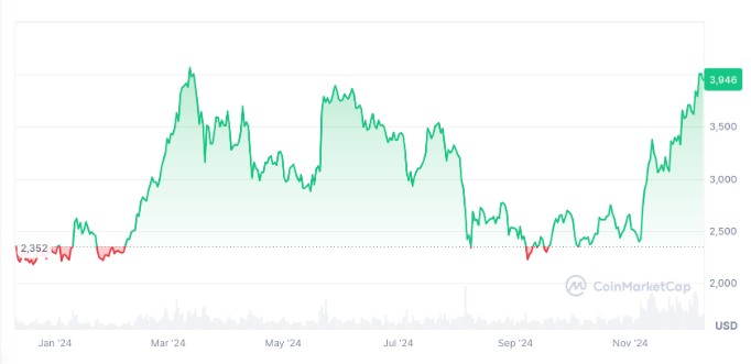 این تنها چند روز پس از آن است که اتر برای اولین بار از مارس 2024 از سطح قیمت 4000 دلار عبور کرد.