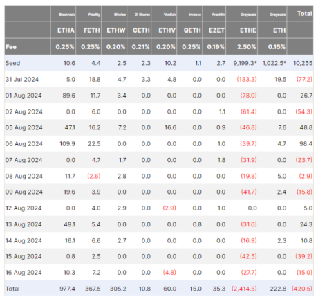 ETFهای اتر ایالات متحده بیش از 420 میلیون دلار فشار فروش را برای دومین ارز دیجیتال بزرگ جهان ایجاد کردند.