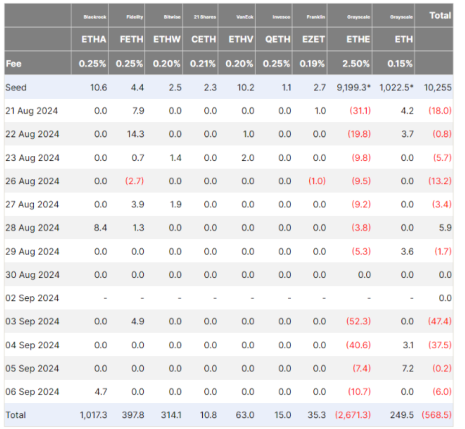 این تا حدودی به دلیل جریانهای منفی مداوم است، زیرا طبق دادههای سرمایهگذاران فارسید، ETH ETFs از زمان راهاندازی بیش از ۵۶۸ میلیون دلار جریان خالص خروجی ثبت کرده است.
