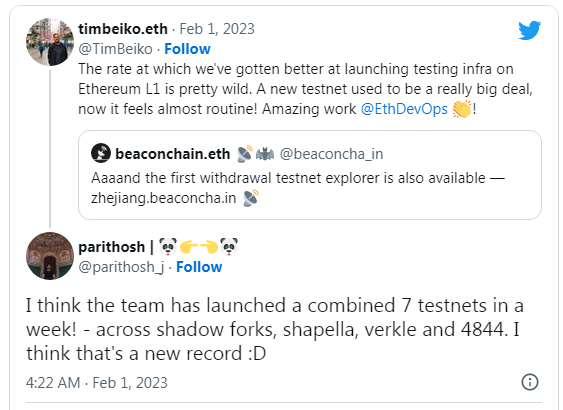 پریتوش اظهار داشت: “من فکر می کنم تیم در یک هفته ترکیبی از 7 شبکه آزمایشی را راه اندازی کرده است! – از طریق shadow forks، shapella، verkle و 4844، فکر می کنم این یک رکورد جدید است.”