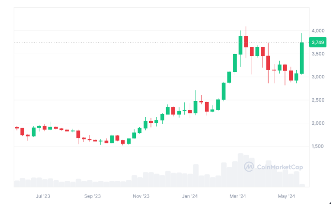 اتر تا 20 ماه مه طی دو ماه 15 درصد کاهش یافته بود، تا زمانی که گزارشها نشان میداد که SEC ممکن است موضع خود را به سمت تأییدیههای ETF معطوف کند، اتر پس از مدت کوتاهی پس از انتشار اخبار در عرض سه روز، 29 درصد افزایش یافت.