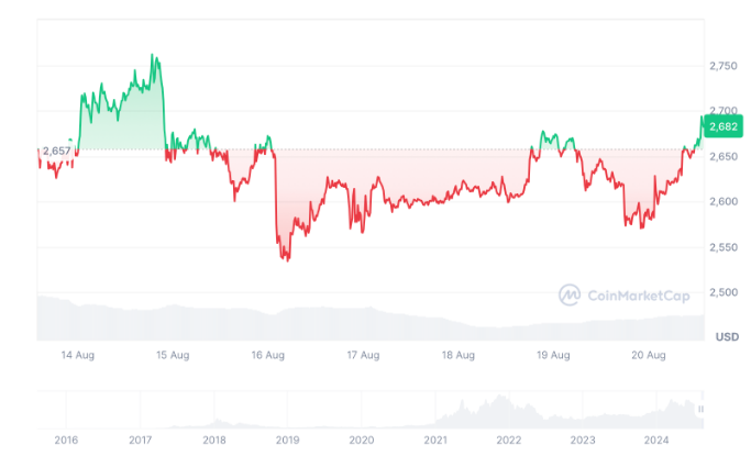 طبق دادههای کوین مارکت کپ، اتر در زمان انتشار با قیمت 2679 دلار معامله میشود که نسبت به 23 جولای 23.57 درصد کاهش داشته است.