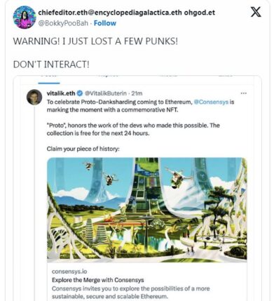 پستی که او به آن اشاره کرده بود از آن زمان حذف شد. در حساب ویتالیک بوترین منتشر شد و مدعی شد که ورود Proto-Danksharding به اتریوم را جشن می گیرد.