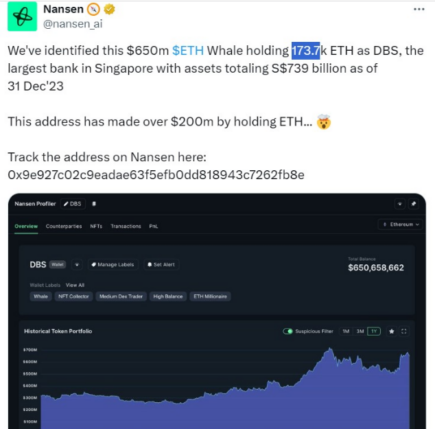در 30 می، شرکت تجزیه و تحلیل بلاک چین نانسن یک “نهنگ” اتریوم را به عنوان موسسه بانکی سنگاپور معرفی کرد. به گفته نانسن، آنها نهنگ را با نام DBS، یکی از بزرگترین بانک های سنگاپور شناسایی کرده اند. نانسن تخمین می زند که کیف پول کریپتو در حال حاضر سود 200 میلیون دلاری از نگهداری اتر داشته است.