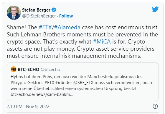 استفان برگر، یکی از اعضای کمیته اقتصادی پارلمان اروپا، سقوط FTX را یکی از «لحظههای Lehman Brothers» توصیف میکند که «باید از آن جلوگیری کرد»، هنگام بحث در مورد لزوم مقرراتی مانند MiCA.