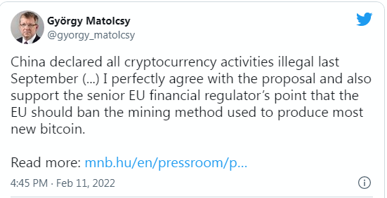 György Matolcsy، رئیس بانک مرکزی مجارستان، پیشنهاد کرده است که ممنوعیت کل استخراج و تجارت ارزهای دیجیتال در اتحادیه اروپا اعمال شود.