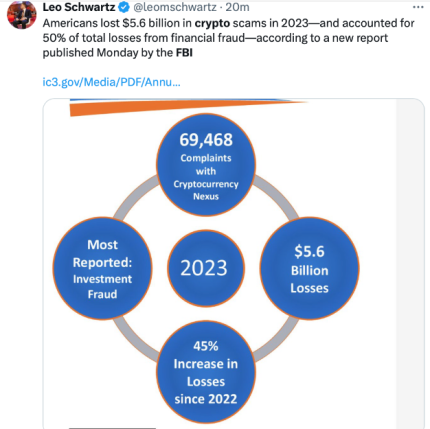مرکز شکایت جرایم اینترنتی دفتر تحقیقات فدرال ایالات متحده (FBI) گزارش تقلب در ارزهای دیجیتال خود را برای سال 2023 منتشر کرده است. آمریکایی ها در آن سال 5.6 میلیارد دلار به دلیل کلاهبرداری ارزهای دیجیتال از دست دادند که 45 درصد نسبت به سال 2022 افزایش داشته است. FBI گفت : شکایات مربوط به رمزنگاری 10٪ از کل دریافتی را تشکیل می دادند، اما تقریباً 50٪ از کل شکایات را در آن سال از دست دادند.