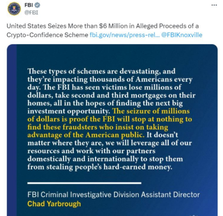 چاد یاربرو، دستیار مدیر بخش تحقیقات جنایی FBI ، گفت که کلاهبرداری های سرمایه گذاری در رمزارز، مانند آنچه که اخیراً کشف شد، “ویرانگر” است و روزانه هزاران آمریکایی را تحت تأثیر قرار می دهد.