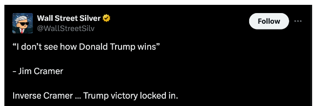 در حالی که ترامپ به تدریج در پلی مارکت از هریس پیشی گرفت، جیم کرامر از CNBC پیش بینی کرد که هریس احتمالا در انتخابات ریاست جمهوری 2024 در بیانیه 11 اکتبر پیروز خواهد شد.