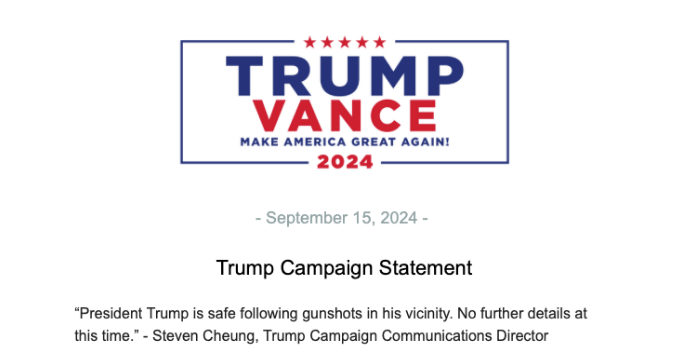 رئیسجمهور سابق ترامپ در پی گزارشهایی مبنی بر شلیک گلوله در اطراف او، «امن» است. استیون چونگ، سخنگوی ترامپ، در بیانیهای در 15 سپتامبر گفت: «رئیسجمهور ترامپ پس از شلیک گلوله در اطرافش در امان است. در حال حاضر جزئیات بیشتری وجود ندارد.»