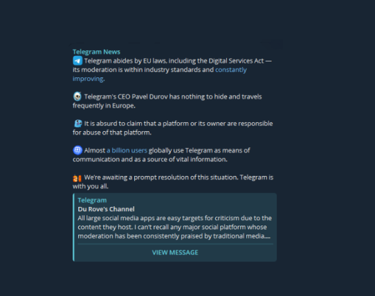 تلگرام در 25 آگوست بیانیه ای رسمی منتشر کرد: