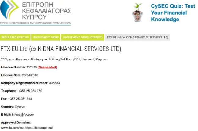 FTX EU تنها در مارس 2022، حدود هفت ماه قبل از سقوط FTX در نوامبر، توسط تنظیم کننده قبرس تایید شد.