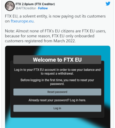 بازوی اروپایی FTX، یعنی FTX EU یک وب سایت راه اندازی کرده است تا به مشتریان اروپایی اجازه دهد درخواست های برداشت را ارسال کنند.