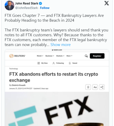 جان رید استارک، مسئول سابق کمیسیون بورس و اوراق بهادار ایالات متحده (SEC) پیشنهاد کرده است که طرح تجدید ساختار FTX ممکن است راهی برای تیم حقوقی برای سود بردن از فرآیند ورشکستگی باشد.