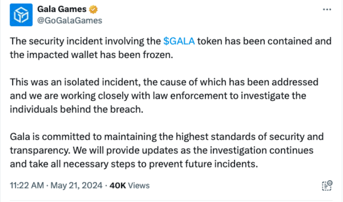 در یک پست X ،گالا گیم اضافه کرد که “حادثه امنیتی مربوط به توکن GALA مهار شده و کیف پول آسیب دیده مسدود شده است.”
