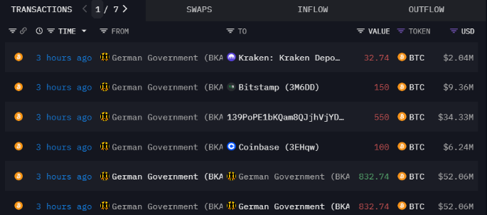 علاوه بر بزرگترین انتقال به ارزش 32 میلیون دلار، بقیه بیت کوین به صرافی های متمرکز منتقل شد ، که نشان می دهد دولت آلمان به طور بالقوه به دنبال فروش بیت کوین است.