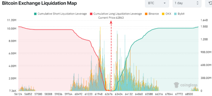 بیت کوین حمایت قابل توجهی را در مرز 61500 دلار کسب کرده است. با این حال، طبق دادههای کوین گلس، یک حرکت به زیر میتواند بیش از ۱ میلیارد دلار موقعیتهای خرید اهرمی تجمعی را در همه صرافیها نقد کند.