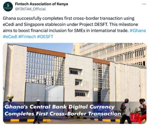 بر اساس گزارشهای مختلف مطبوعات محلی، بانک غنا (BOG) و اداره پولی سنگاپور (MAS) یک طرح اثبات مفهومی برای پروژه توکن نیمه تعویضپذیر اقتصاد دیجیتال (DESFT) را تکمیل کردهاند. هدف از این پروژه تشویق تجارت بین شرکتهای کوچک، کوچک و متوسط (MSME) در دو کشور است.