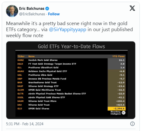 بر اساس پست X اریک بالچوناس، تحلیلگر اطلاعاتی بلومبرگ در 14 فوریه ، 14 ETF طلا در سال 2024 تاکنون 2.4 میلیارد دلار خروجی داشته اند.
