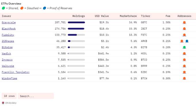 GBTC گری اسکیل بزرگترین ETF توسط سرمایه گذاری های زنجیره ای بیت کوین است که در حال حاضر دارای بیش از 287801 بیت کوین به ارزش 19.3 میلیارد دلار است که 34.9 درصد از سهم بازار را در اختیار دارد. با این حال، گری اسکیل همچنین سرمایه گذاران را ملزم به پرداخت بالاترین هزینه – 1.5٪ در مقایسه با استاندارد صنعتی 0.20٪ تا 0.25٪ می کند.