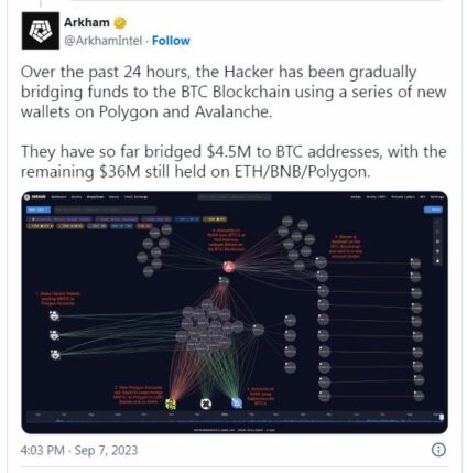 520,000 MATIC و 300 BNB – که مجموعاً 328,000 دلار است – به 4.5 میلیون دلار وجوه دزدیده شده که به بلاک چین بیت کوین (به شکل در 7 سپتامبر، طبق گفته شرکت امنیتی بلاک چین Arkham) پل زده شده است، اضافه می کند.