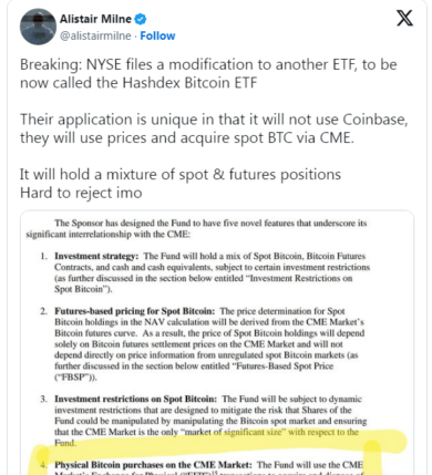 رویکرد هشدکس با پروندههای اخیر متفاوت است، زیرا به توافقنامه اشتراک نظارت کوین بیس بستگی ندارد، بلکه تصمیم میگیرد بیتکوین نقطهای را از مبادلات فیزیکی در بازار CME خریداری کند. بر اساس یک پرونده 19b-4 توسط NYSE Arca در SEC ایالات متحده، هشدکس قصد دارد بیتکوین نقطهای را در ETF آتی بیتکوین خود بگنجاند و نام آن را تغییر دهد و علامت خود را به ETF بیت کوین هشدکس تغییر دهد.