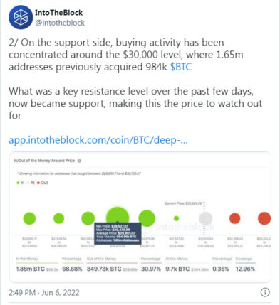 برای تعیین سطوح حمایت و مقاومت محلی، IntoTheBlock از معیاری استفاده می کند که حجم ورودی ها را در حدود یک قیمت مشخص نشان می دهد. در حال حاضر شاهد شکل گیری یک سطح قیمتی مهم در حدود 30000 دلار با حجم کل 980000 BTC هستیم.