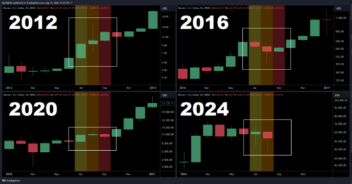 پایین بالقوه با الگوهای تاریخی مشاهده شده در سال های انتخابات قبلی ایالات متحده مطابقت دارد، جایی که بیت کوین به طور مداوم در سه ماهه سوم، معمولاً در حدود جولای یا آگوست، پایین ترین سطح محلی خود را پیدا کرده است.