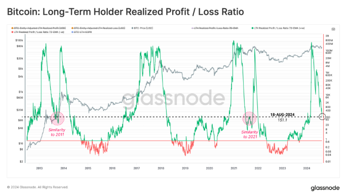 در همین حال، نسبت سود/زیان تحقق یافته همچنان بالاست اما نشانه هایی از کاهش قابل توجه نسبت به اوج خود را نشان می دهد، که نشان می دهد LTH ها شروع به کاهش فعالیت های سودآور خود کرده اند.