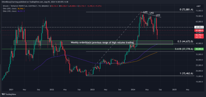 سطوح پایین 40 هزار دلاری به عنوان محدوده ادغام از دسامبر 2023 تا فوریه 2024 عمل کرد.