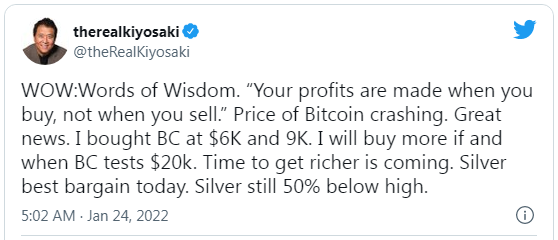 کیوساکی در توییتی اعلام کرد که این خبر عالی است که قیمت بیت کوین به میزان قابل توجهی کاهش می یابد. او به دنبال کنندگان خود یادآوری کرد که بیت کوین را زمانی خریداری کرده است که با قیمت های 6000 و 9000 دلار معامله می شود، در حالی که قبلا توییت کرده بود که بیت کوین را نیز با افت خریده است.