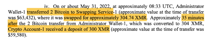 روبنس حداقل چهار انتقالی را که FBI ردیابی کرده بود نشان داد که ظاهراً کیف پول رمزنگاری لین را نشان می دهد که بیت کوین مشتق شده از بازار ناشناس را به یک “سرویس مبادله” می فرستد تا آن را با XMR مبادله کند – که سپس به یک حساب صرافی رمزنگاری که FBI ادعا می کند متعلق به Lin است واریز شده است.