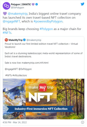 پالیگان این خبر را به اشتراک می گذارد که “makemytrip”، یکی از بزرگترین شرکت های مسافرتی آنلاین هند، مجموعه NFT مبتنی بر سفر خود را بر روی ngageNFT مجهز به پالیگان راه اندازی کرده است.