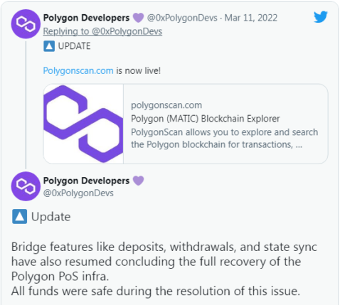 شبکه پالیگان گزارش می دهد که زنجیره PoS PoS از زمان Fix آخر هفته به فعالیت های عادی خود ادامه داده است. ویژگی های پل مانند سپرده ها و برداشت ها نیز با پایان یافتن بازیابی کامل پالیگان PoS infra از سر گرفته شد. پالیگان میگوید که همه وجوه در طول حل این مشکل امن بودند.