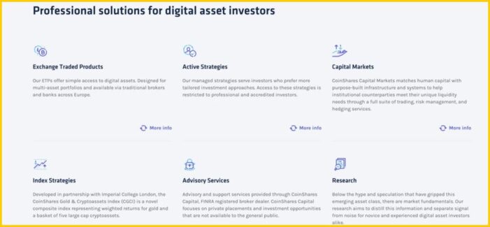 CoinShares معادل Grayscale است. تفاوت این است که CoinShares در اروپا فعالیت می کند و میزان مدیریت آنها به میزان قابل توجهی کمتر از چیزی است که Grayscale مدیریت می کند. CoinShares خدمات و محصولات مختلفی را برای مشتریان خود ارائه می دهد ، از ETPs (محصولات قابل معامله در بورس) تا مشاوره سرمایه گذاری ساده.