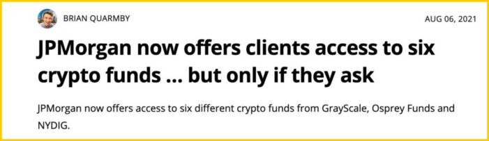 یکی از اخبار مهم اخیراً برای کل بازار رمزنگاری ، JP Morgan بود که اعلام کرد شش صندوق رمزنگاری مختلف را برای مشتریان داخلی خود در دسترس قرار می دهد. این خبر بسیار خوبی است وقتی حتی بانک هایی که به طور بالقوه می توانند ضربه بزرگی از رمزارزها وارد کنند باید بپذیرند که مشتریانشان می خواهند روی ارزهای رمزنگاری شده سرمایه گذاری کنند ، در غیر این صورت آنها این کشور را ترک خواهند کرد.