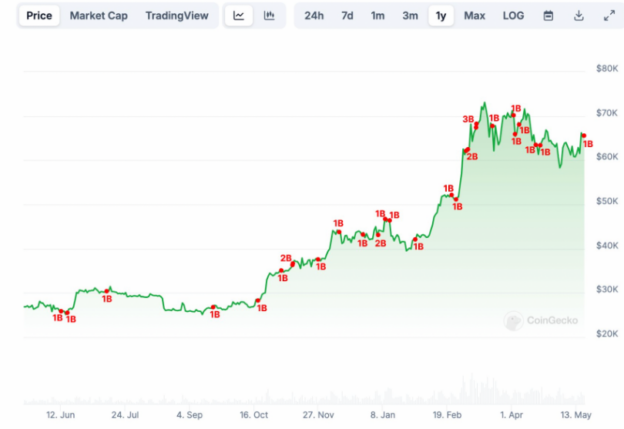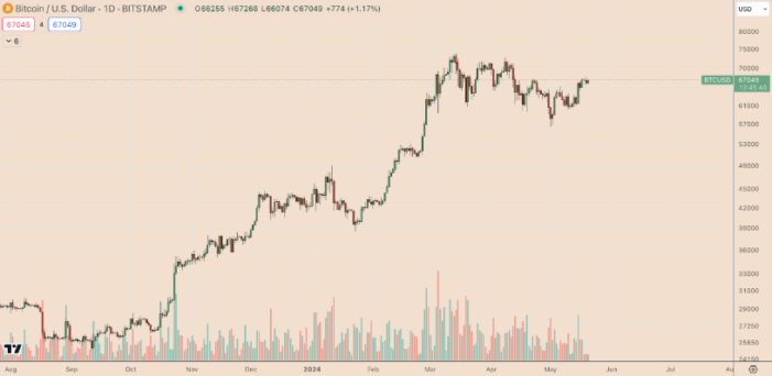 قیمت بیت کوین سه هفته پس از رسیدن به کمترین قیمت دو ماهه یعنی حدود 56550 دلار، بیش از 19 درصد افزایش یافته است و در 20 می به حدود 67270 دلار رسیده است. با این حال، اصلاح شدید در روزهای آینده ممکن است رخ بدهد.