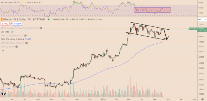 قابل ذکر است که BTC/USDpair از ماه مارس که رکورد خود را به حدود 73800 دلار ارتقا داد، در داخل چیزی که به نظر می رسد الگوی پرچم گاو نر است، روند رو به رشدی داشته است. از 20 می، قیمت BTC در حال آزمایش خط روند بالای پرچم برای شکست احتمالی بود.
