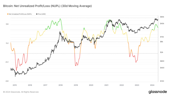 به طور معمول، مقدار NUPL بیش از 0.5 به یک احساس بازار مطمئن اشاره می کند که به طور بالقوه راه را برای افزایش بیشتر قیمت هموار می کند. با این حال، مهم است که توجه داشته باشید که NUPL نسبت به اوج سال 2024 خود یعنی 0.68 که در ماه مارس ایجاد شد، کاهش یافته است.