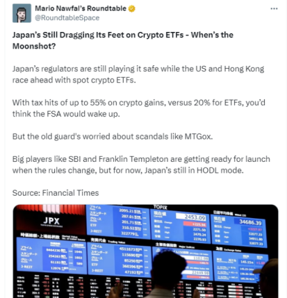 ماریو نوفل، کارآفرین و مجری «The Roundtable Show» در X، رویکرد ژاپن به ETF های رمزنگاری را به عنوان «هنوز در حالت HODL» توصیف کرد.
