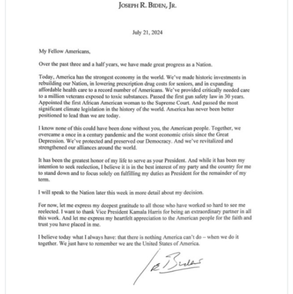 در بیانیه 21 جولای، بایدن به دلایل خود برای تسلیم اشاره نکرد اما ادعا کرد که این به نفع حزب من و کشورم است. غیبت او باعث می شود که حزب دموکرات بدون نامزدی برای انتخابات ریاست جمهوری 2024 آمریکا در 5 نوامبر باقی بماند.
