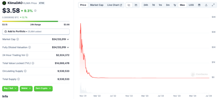 طبق دادههای CoinGecko، KLIMA در زمان انتشار تنها با قیمت 3.55 دلار معامله میشود که 99.9 درصد نسبت به بالاترین قیمت خود یعنی 3777 دلار در 21 اکتبر 2021 کاهش یافته است.