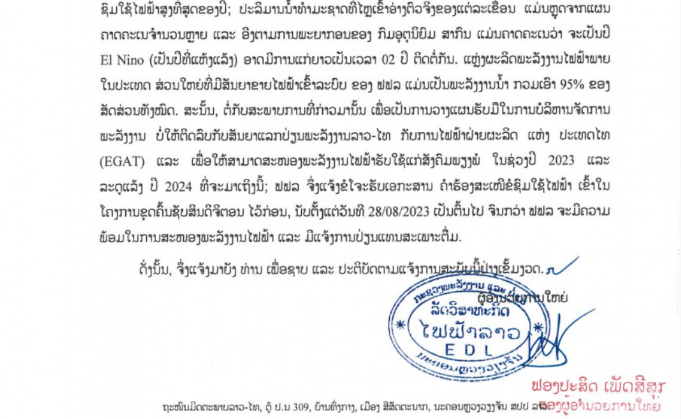 بر اساس این اطلاعیه، لائوس در نیمه اول سال 2023 خشکسالی را تجربه کرد. گرمای شدید منجر به تقاضای بیشتر برای برق شد و باعث شد نیروگاه های برق آبی برای تولید برق کافی با مشکل مواجه شوند.