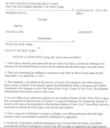 شوارتز گفت که از اعتماد به چت ربات مصنوعی بدون انجام بررسی های لازم متاسف است. در این سوگندنامه آمده است: