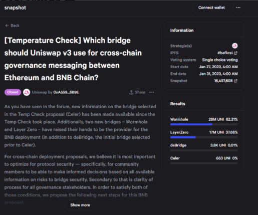 در 31 ژانویه، DAO دومین رأی گیری در مورد اینکه کدام پل باید برای حکمرانی استفاده شود، برگزار کرد. Wormhole برنده رای شد و به عنوان پل رسمی برای حکومت انتخاب شد.