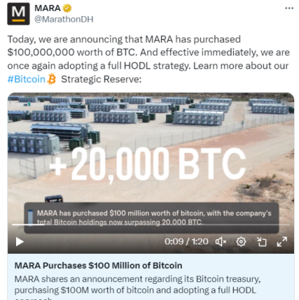 “امروز ماراتن مفتخر است اعلام کند که برای تقویت استراتژی نگهداری بیت کوین به عنوان دارایی ذخیره استراتژیک خزانه داری ما، در ماه گذشته 100 میلیون دلار بیت کوین خریداری کرده ایم و اکنون به صورت کامل HODL @saylor خواهد بود.”